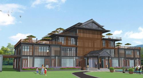 水上建筑設計適宜采用通透的建筑外殼,輕盈的建筑造型,因此該水上運動中心建筑設計采用現代風格,采用鋼架結構的形式,建筑材料專用采用鋼構架、防腐木和玻璃,屋頂設計采用流線型,挑出屋頂的柱子和鋼絲拉線與現狀水上高爾夫的張拉膜結構形成統一風格。